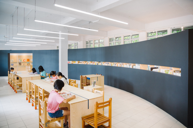 於是,設計團隊選擇將位於1樓的2間閒置教室打通,來為孩子們打造一間全新的圖書室,用一道橫跨整個空間的半弧形書櫃牆貫穿。以具有環保、再生特性的樺木夾板製作書櫃,運用纖泥板牆面加強隔熱、除濕及吸音的效果。座椅則以學校的舊課椅改造;新的書櫃配合小學學生身高打造,方便孩子取書;並輔以容易辨識又美觀簡潔的圖書分類系統,打造真正適合學生使用的校園美感圖書室。