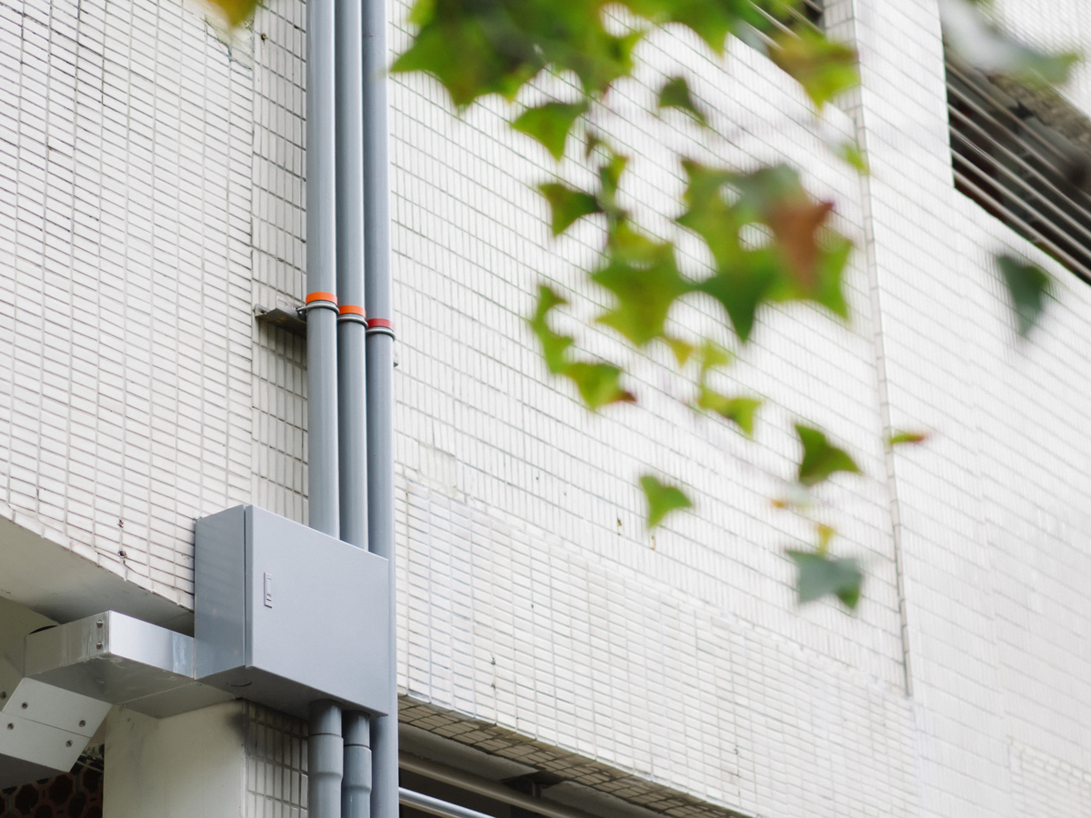 我們先解析兩棟建築外牆的管線走向與整體色彩,然後採用減法設計把管線進行拆除整合,並統一使用灰色管,輔以色彩環標註管線,A棟管線為「棕色:化糞管,橘色:電線管路,藍色:排水管」,C棟管線分別為「黃色:給水管,橘色:電線管路、紅色:消防管」;讓整體管線整齊劃一,色彩具系統性與和諧性。