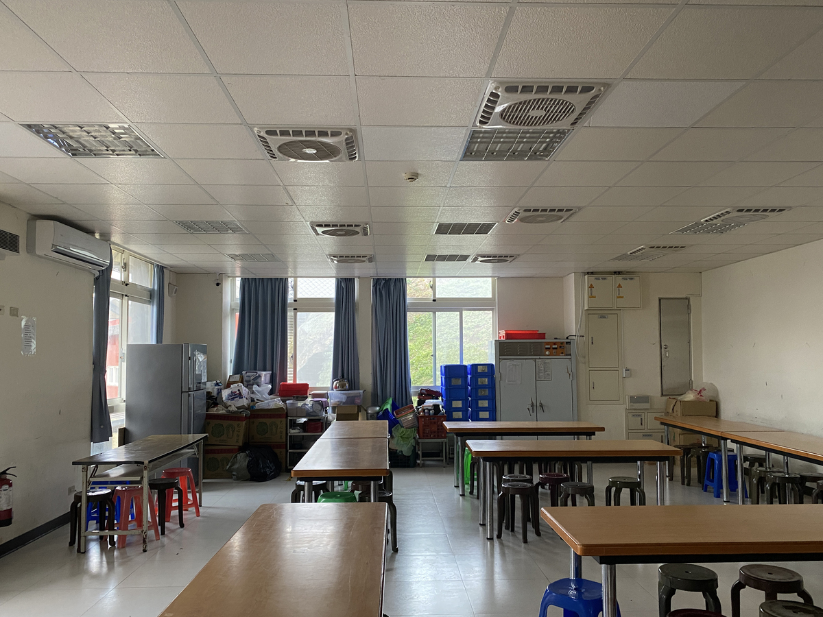 設計團隊以天花板抽風設備來解決空間對流問題。由於這裡兼具用餐、自習及教學的功能,因此在廚房、用餐區兩間設置收納與教學兼用的雙向收納櫃,除可收納廚具設備與食材外,收納櫃拉門則結合書寫白板的功能,供老師教學,以及公布每日菜單。設計團隊新增中島作為打菜區域,重新規劃打菜動線。課桌椅則可隨用餐或學習情境改變擺放方式,將舊有鋁窗拆除改為窗邊平台,把使用範圍延伸到戶外,除增加空間明亮度與解決空氣流通問題之外,學生亦可於平台上閱讀與休憩,讓空間使用方式更彈性。