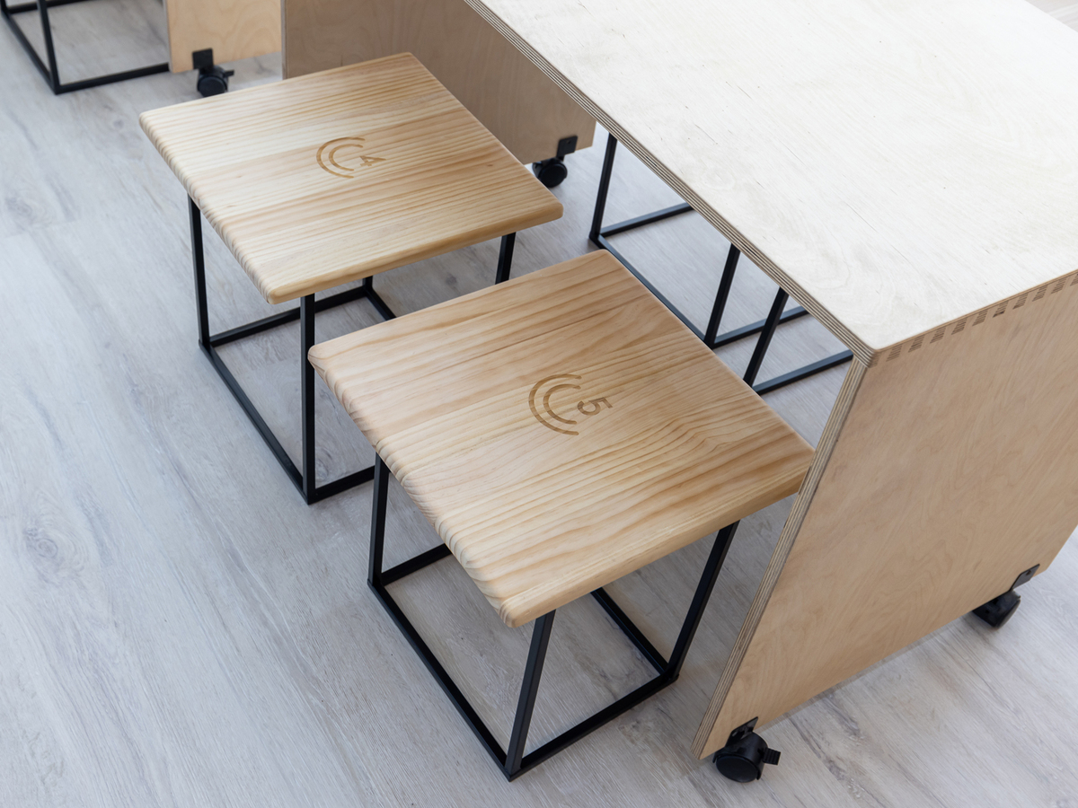 設計團隊在改造計畫中帶入產品設計思維,從組合及單元的設計出發,以組合式椅子加強收納的機能性,並透過組合式的造型燈箱結合燈光設計,營造空間氛圍,並透過工作坊帶領使用者(老師、學生)了解設計的可能。